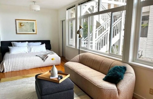 Beautiful views across the San Francisco bay awaits you at this fabulous large 1 bedroom apartment. Stylishly furnished with a loft style lay-out provides views from all parts of the open space living area. Centrally-located in Russian Hill two blocks from famous Lombard St. and easy walking distance to North Beach, Chinatown, Ghirardelli Square and Polk Street with plethora of amazing restaurants and nightlife. Perfect for business trips, conferences or couples vacations.