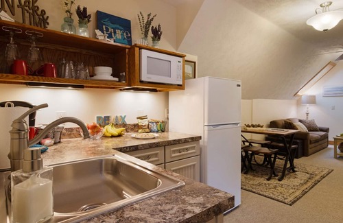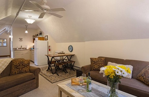 This suite is accessed at the side of the house from a paved sidewalk. It has charming angles due to the age of the home that make this a unique get away. There is WIFI and cable TV. The living space and bedrooms have TVs with a Smart TV in the living space so you can stream your own movies if you would like. Bathroom contains a shower/tub combination; the tub is deep if you would like a nice soak. The house contains 3 apartment suites all with individual entrances and a commercial space rented to a law firm also with a separate entrance. Access to the parking lot is through the alley which runs behind the building.