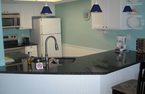 The master bedroom features a King-size bed while the second bedroom is complemented with a queen and a twin rollway bed. There is also a full sleeper sofa in the living room. Our newly renovated kitchen is fully stocked with cooking needs and even features a spice rack to accent your cooking flair.