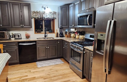 The Living Room is called 'THE FOUR SEASON RETREAT 'and is a comfortable place to gather with family and friends for talks and laughter around the warm and cozy wood stove. The couches are deep and soft with pictures and decorating items depicting nature in all its' seasons and wonder. There are battery lite candles for your ambiance in the deep window sills