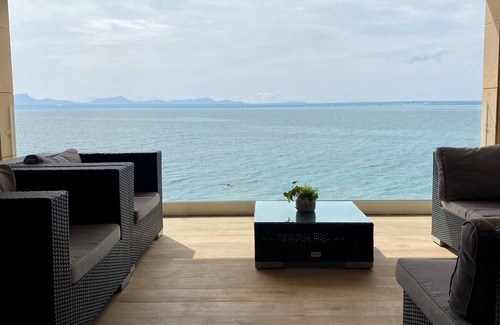 On the first floor We have a double bedroom (one bed for two people) with bath en suite, living room with fireplace, satellite TV and large windows to enjoy the spectacular views of the Bay of Alcudia just 10 meters from the sea. A large well equipped kitchen and pantry. All the rooms have access to the terrace (ideal for relaxing with family or friends meals), laundry room and a guest toilet.