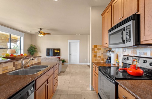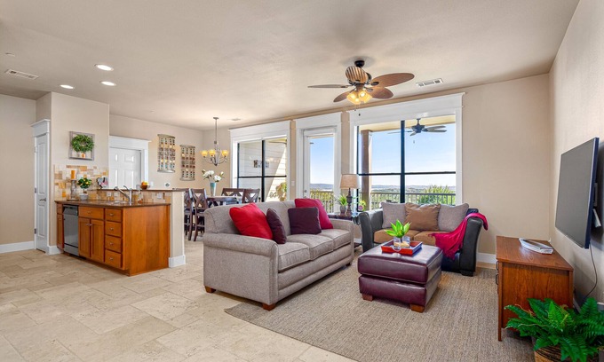 Great lake views, awesome large porch, all new interior and a private attached garage! Perfect for affordable weekend escapes with beautiful views of Lake Travis and the Hill Country. This 1,045 SF Hilltop Villa has 2 bdrm/2 bath and a large porch with a great outdoor living, dining and grilling area. The Hollows offers amazing resort amenities; 15 miles of hiking trails, 4 pools, a spa pool and hot tub, Grill/Bar, smokehouse grills, outdoor kitchen areas by the pools, playground, lakefront access, fitness center, marina with boat and jet-ski rentals.
