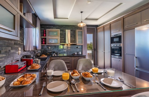 Entering the front door, the living space is an open plan area. The air conditioned lounge is a clean, modern space with bright colour accents. With a large comfortable corner sofa, 2 large poufs, 2 armchairs and a coffee table, there is plenty of space to chill out. The 42" Smart TV has Satellite and Netflix to keep you entertained, along with a Playstation 4. A patio door opens onto the front veranda overlooking the pool and provides access to the outdoor seating area with coffee table, chairs and sofa. The indoor dining table with its padded chairs, is situated next to the lounge area, overlooking the pool and outdoor area with large windows, allowing plenty of light and the countryside views to enter into the living space.