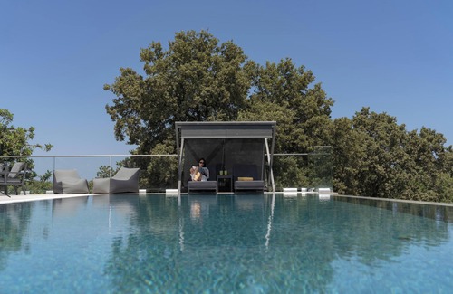 - A glass balcony surrounds the pool, ensuring uninterrupted views of the natural gardens.