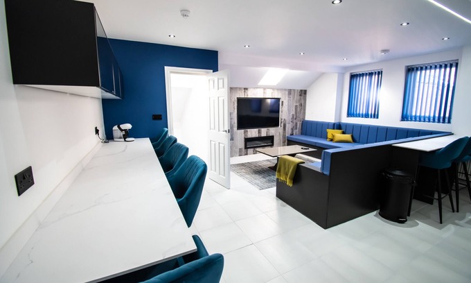 Grosvenor Suite is a beautiful spacious three bedroom apartment, sleeping up to 9 people. Furnished to a modern & very high standard. Internally the property has an open plan kitchen/dining space with every essential you would require to make it a home away from home with all kitchen appliances. The Function Room/Living room has a 75inch Smart TV for a cinema feel & It also benefits from two luxury bathrooms.