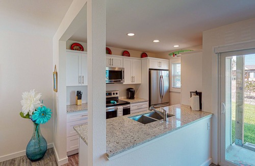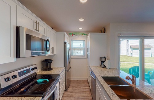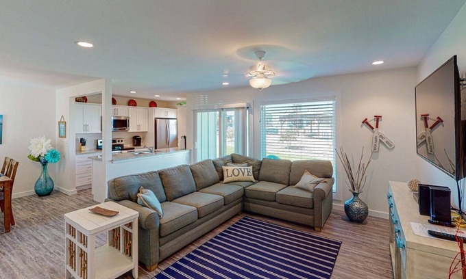 HipNautic is a newly remodeled, ground-floor condo that has an open floor plan overlooking the shared pool/hot tub. Entertain in the open living room with a large sectional, TV, cable, and Wi-Fi. Adjacent is the dining table with seating for 6. Practice your culinary skills in the galley-style kitchen with new stainless steel appliances, granite counter space, pots, pans, and utensils. Enjoy your morning coffee off of the back patio which has a view of the shared pool and grilling area. The guest bedroom (BR1) has a Twin over Full bunk bed, an additional Twin bed, and a TV. The guest hall bathroom has a tub/shower. The laundry room with a washer and dryer is at the end of the hall. The master bedroom (BR2) is at the end of the hallway. It has a King-size bed, chest for your beach attire, TV, nightstands, and closet. The ensuite bathroom has a large walk-in shower with a glass enclosure. The bathroom has private access to the laundry room. Enjoy the close walking proximity to the Marina to watch the dolphins. Shops, restaurants, and bars are only 0.5 miles away and it is a short 1.3-mile drive to the beach. The property comes with a 6-seater golf cart for you to use during your stay! 6-Seater Golf Cart Included - Subject to a $10 Fuel Charge – Short Term Stay Only