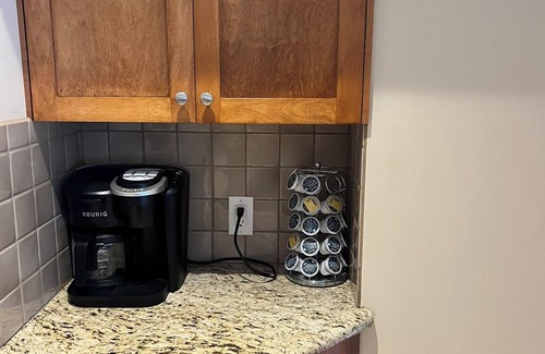 The living room, with leather sofa and casual chairs, features a water and pool view. The kitchen is fully equipped and ready for entertaining! It includes stainless steel appliances (refrigerator with ice maker, stove, dishwasher, and microwave), maple cabinets, and an island with barstools. All dishes, cutlery, utensils, pots, pans, 4-slice toaster, Ninja blender, Keurig and full pot coffee maker, even a slow cooker!
