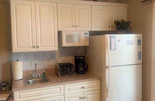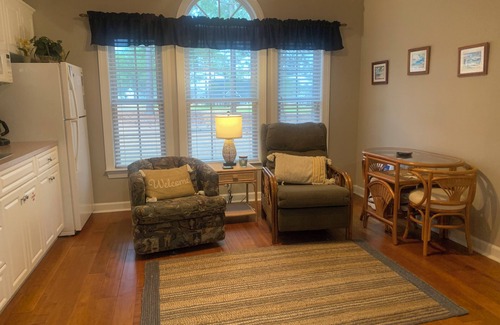 The condo, with its unique floor plan, has enough space that everyone can have their private time. The main villa has the master bedroom (2 full beds) with television, full bath, fully equipped kitchen and living/dining room with television. The screened porch has a table for 4 with a ceiling fan and a charcoal grill and access to the lawn. The mini suite can be closed off for privacy and also includes an external entrance. It has its own thermostat. There are two full bedrooms, a full bathroom, kitchenette (w/full refrigerator, microwave, coffee pot and sink), a TV with sitting area. There is a table for two and also a desk if you need to work remotely. The desk setup includes a monitor and wireless apple keyboard as well as a printer.