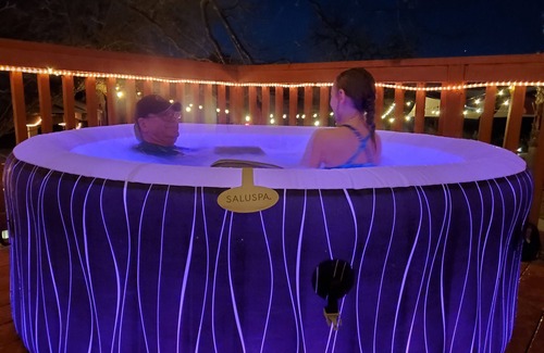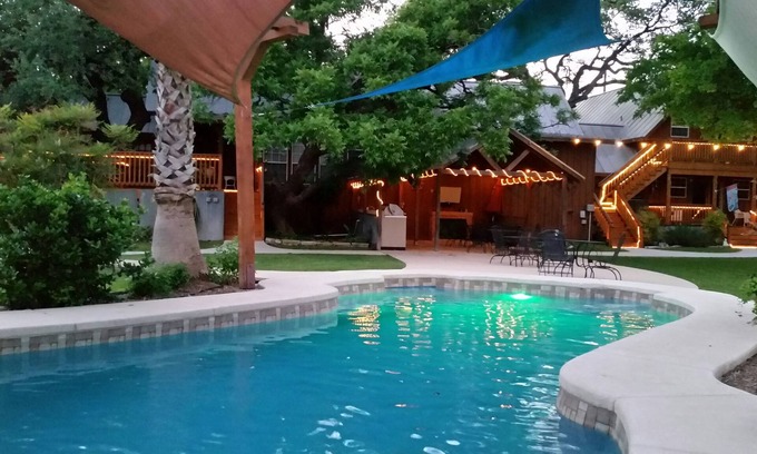The Gruene River Guest House is a great location to experience all that the New Braunfels & Gruene area have to offer. Situated on 5 beautiful acres of open green space with 300 feet of Guadalupe River frontage it is the perfect location for family reunions, corporate events, small intimate weddings or any group gathering of up to 20 people. The Gruene River Guest House features 4 separate guest suites with 5 bedrooms which sleep 20 in total each with their own private entrance, smart TV and individual AC/Heat. The outdoor Cantina consist of a large covered kitchen and dining area with a huge propane grill, stove burners, ice machine, refrigerator, refrigerated drawers, microwave and sink. It has a 70" large screen outdoor smart TV, bluetooth enabled sound bar, multiple hot weather fans, cold weather propane patio heater, propane fired fire table, a 10 foot long raw edge cedar plank bar and a wide array of lighting. A wood/charcoal smoker is also available. There is a large deck shaded with large old oak and pecan trees with a Saluspa Hot Tub available with a $20 preparation fee and last but not least a beautiful private swimming pool. Along the river front there are huge ancient cypress trees towering over a private river landing for toobing, kayaking, fishing, or just hanging out in the river. Toobs and kayaks are available for guest use. Also, there is a walkway down to a shaded shallow area just in front of rapids perfect for little ones or lawn chairs in the water. There is a beautiful Gazebo perfect for a romantic riverside wedding or picnic by the rapids. In the open 5 acres there is a volleyball net and a 5 hole disc golf course. Also, there is a volleyball net for the swimming pool and an outdoor ping pong table. A golf cart is available for rent for $50/day to tool around the property and allow easy access to the river. On summer weekends multiple Guest House water cannons shoot water into the air at the riverfront to cool passing by toobers. All in all something for everybody!