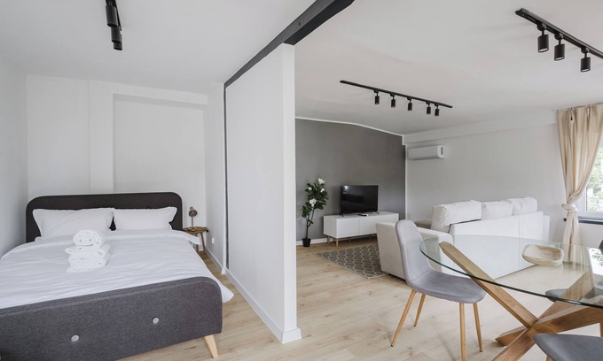 Grunwald Raszyńska Bright Apartment features a living room with a sofa bed, a separate sleeping area with a sofa bed and a comfortable double bed, a kitchen, and a bathroom. It offers a range of high-standard amenities including free WiFi, a TV, hairdryer, iron, washing machine, fridge with freezer, oven, electric stove, kettle, and kitchen accessories. The apartment also features air conditioning, providing extra comfort especially during hot days. Guests may use the public parking available near the building, although parking spaces are not guaranteed.