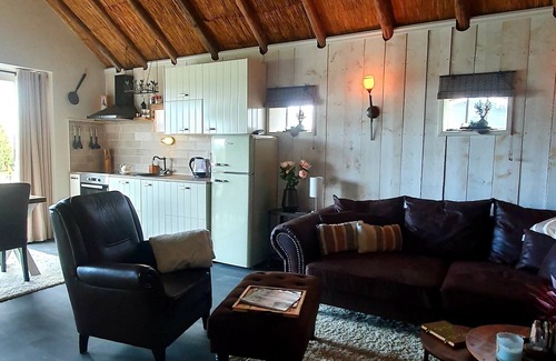 The relaxation/living area has a large lounge sofa where you can comfortably lie next to each other and watch television. The TV has digital channels and Chromecast to watch and stream your favorite movies and programs from your phone. There is also a Bluetooth soundbar to stream your own music. The room is heated by a pellet stove and central heating.