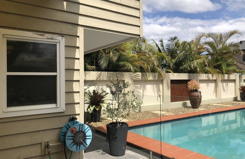 It features a bedroom with a Queen size bed, kitchen/dining area, laundry/bathroom with washing machine, two lounges, two TV's, microwave, heater, fans, as well as access to a private pool shared only with the owners of the property.