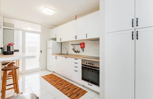 The kitchen is fully equipped with essential cookware and cutleries that you'll need to cook delicious meals, such as a stove, an oven and a microwave.The apartment also has a washer and ironing equipment for your laundry needs.