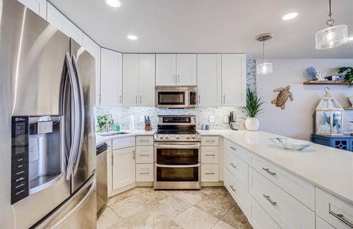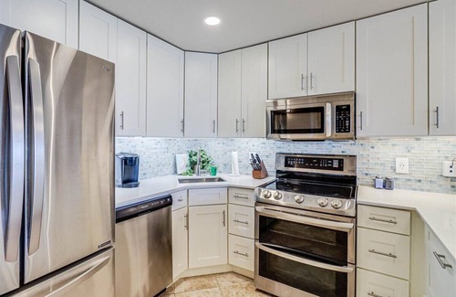 The updated kitchen is not only beautiful, but it is a chef's dream. It is fully outfitted with a stainless steel double oven/cooktop range, dishwasher, full-size frig with water and ice maker, and complete set of cookware and serving ware. The design includes even the smallest details of quiet-close drawers and cabinets.