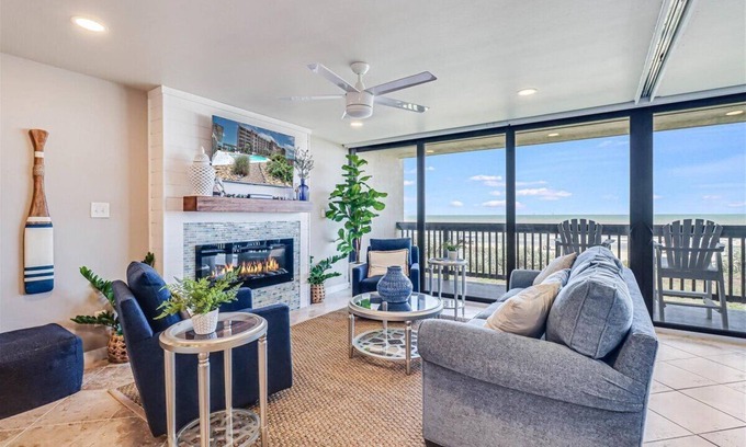 The living room is oceanside and overlooks the beach and surf through a sliding glass wall of windows. It is fully updated with new comfortable furniture and organized around a shiplap wrapped entertainment wall that includes a smart tv and a FIREPLACE to provide year-round ambiance and extra heating during winter months.