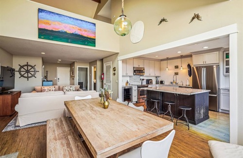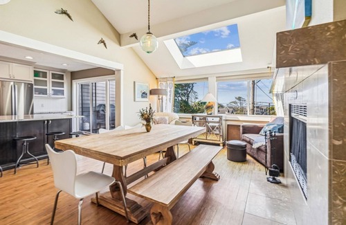 A dining table, with seating for six, is located in front of the fireplace and under the skylight. The muted colors of this large living space make it peaceful and serene. This is the ideal spot for gathering together to enjoy a movie or sporting event on the large flat-screen TV or just have a family game night and catch up on the day's events.