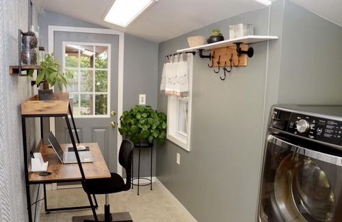 Steps away, prep and cook meals in the well-lit, fully equipped kitchen with all the standard major appliances – refrigerator, stove/oven with built-in air fryer, dishwasher, microwave – plus useful small appliances – blender, toaster, and stand mixer. You’ll find plenty of counter space – including the kitchen island – and all the cookware, bake-ware, dishware, flatware, glassware, serving-ware, utensils, plus oil and spices, you need to prepare and serve your favorite recipes.