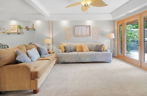 Access the remarkably well-equipped cottage via convenient keyless entry and make your way through the open-concept floor plan to the living room where you’ll find plush, comfy seating for the whole family. You’ll love the natural light streaming in and the easy access to the delightful backyard through the glass french doors.