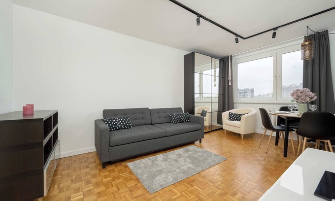 This traditional and atmospheric apartment is designed for four people. It is located on the sixth floor, so that the furnished balcony, which can be accessed from the bedroom, overlooks the peaceful and friendly neighborhood and the cityscape. In the cozy living room stands a dark gray double sofa bed, where you can sit down in the evenings to relax with your favorite programs on terrestrial television. The room is also furnished with a comfortable cream-colored armchair, a dining table with chairs and cabinets for handy trinkets. Meals can be prepared easily and quickly in the functionally furnished kitchenette with such appliances as a gas stove, oven, microwave, washing machine and electric kettle. The apartment has one intimate bedroom, which houses a large and comfortable double bed and a capacious closet ideal for storing your brought belongings. In the bathroom, a welcome toiletries set with towels, a hairdryer and a bathtub await guests, perfect for those who appreciate evening relaxation after a day's activities. The decor is dominated by shades of gray, black and white, making the arrangement subdued and stylish. There is also no lack of wooden accents, which take care of the friendly atmosphere in the interior.