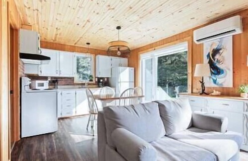 Escape to this charming and super cozy chalet, nestled in a peaceful wooded area, right next to the Mont Grands-Fonds ski resort. With its two comfortable bedrooms — one with a Queen bed and the other with single bunk beds — it’s the perfect place for a family or friends getaway.