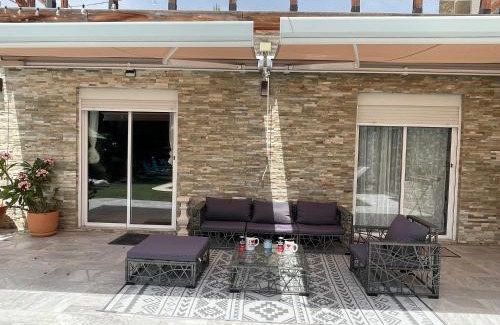 Food & DrinkTea/Coffee makerBathroomFree toiletries, Toilet paper, Body soap, Towels/Sheets (extra fee), Bathtub or shower, Private bathroom, Shower, Toilet, Bidet, TowelsMedia & TechnologyMobile hotspot device, Flat-screen TV, TVGeneralKey access, Hardwood or parquet floors, Fan, Air conditioning, Trash cans, Fire extinguisher, HeatingKitchenElectric kettle, Kitchenette, Coffee machine, Kitchenware, Kitchen, Dishwasher, Refrigerator, Toaster, Wine glasses, Microwave, Dining table, Cleaning products, StovetopLiving AreaSitting area, Dining area, Desk, SofaOutdoorsOutdoor furniture, Patio, Outdoor dining area, Barbecue, TerraceBedroomLinens, Walk-in closet, Wardrobe or closetViewGarden view, Pool view, Inner courtyard view, ViewAccessibilityEntire unit located on ground floorRoom AmenitiesNon-feather pillow, Sofa bed, Clothes rack, Socket near the bed, Drying rack for clothingEntertainment & Family ServicesBoard games/puzzlesPool and SpaShallow end, Pool with a view, Pool towelsPhysical distancingSingle-room AC for guest accommodation |