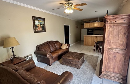 This little hacienda is in the back of the property, with plenty of parking and in a quiet neighborhood. With a Spanish rustic exterior, the interior has cozy furnishings on the inside. Complete with leather furniture, full kitchen, two bedroom and one bathroom. Even a fenced in area for those little dogs to run. If you are looking for extra space you can rent our other listing (Small Town Oasis) that sleeps 16! Pool is possibly available upon request.