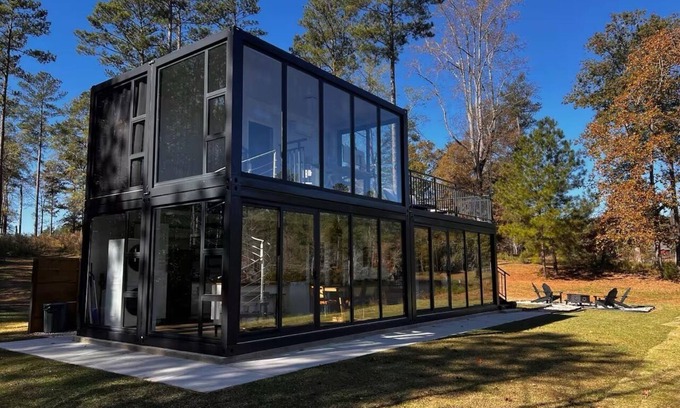 Focus on work projects or yourself at this glass and steel container-inspired cabin.