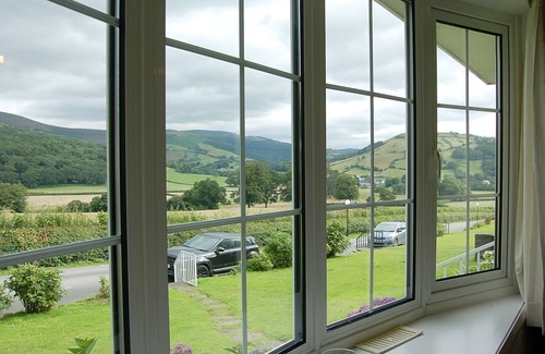 To the front, off the separate front entrance, the sitting room and hallway have laminate flooring. It enjoys uninterrupted rural and hillside views, with a big bay window, Panasonic TV, Video Player, DVD, Two armchairs and 3-seater cosy fabric sofas, plus a coffee table.
