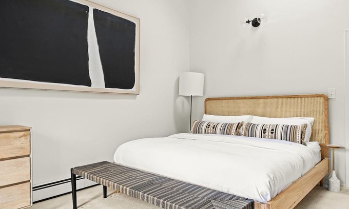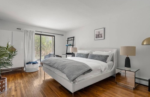 This home is filled with a ton of natural light, modern appliances and modern finishings. The open plan living kitchen space has high ceilings and allow you to enjoy the spacious kitchen/breakfast bar while overlooking the living/dining room which also has a wood burning fireplace. There are 2 King bedrooms where each has their own private patio and the downstairs king has an office space /desk for remote working and private bathroom. The Queen bedroom has 2 skylights and is full of natural light where there is also a Stokke converted toddler bed if needed; there is also an option of a Bugaboo travel crib for a littler one (please request) . All bedrooms have blackout blinds/curtains. Outside you have a pool which is cleaned weekly with loungers, umbrellas, BBQ outdoor dining table and deck chairs. The area has a plethora of wonderful restaurants, as well as marinas and farmer's markets. Please note that we can accommodate 6 adults, 1 toddler and 1 baby (travel crib).