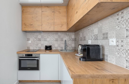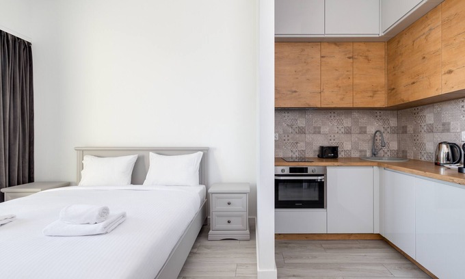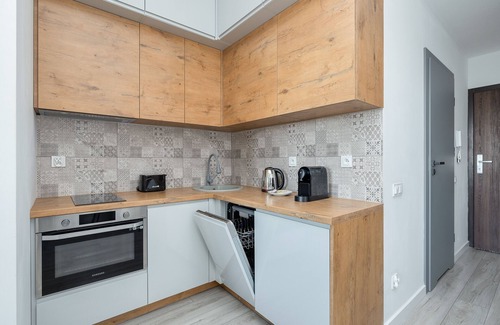 Hanza Tower Studio 738 is a stylishly furnished apartment that features a room with a comfortable king-size bed and a kitchenette, a bathroom, and a spacious balcony where guests can relax and enjoy their morning coffee or an evening glass of wine. It offers a range of top-class amenities, including free WiFi, terrestrial TV, a washing machine, an iron, a hairdryer, a dishwasher, an oven, a fridge with a freezer, a Tchibo coffee maker, a toaster, and kitchen accessories. The apartment also has air conditioning, providing exceptional comfort, especially during hot days. Guests also have access to the building's public SPA area, including a swimming pool and a sauna.
