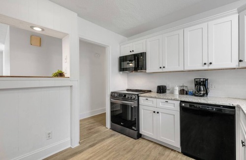 The spacious kitchen is fully equipped with an oven, microwave, and dishwasher, along with all the essential cookware and dining items you'll need to whip up delicious meals. Off the hallway, you'll find three cozy bedrooms and a well-appointed bathroom. The first bedroom to your left features a king bed and conveniently houses the washer and dryer, along with an iron and ironing board for added convenience.