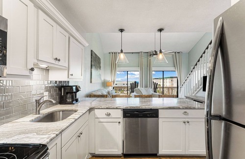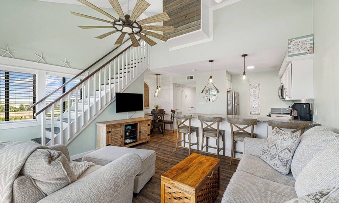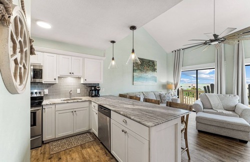 Upstairs, the airy loft overlooks the living space and is furnished with two queen beds, a custom wardrobe, and a 32" flat-screen TV. Enjoy stunning sunsets and the sound of waves as you drift off to sleep. Downstairs, the bathroom has been updated with a granite vanity and new fixtures.