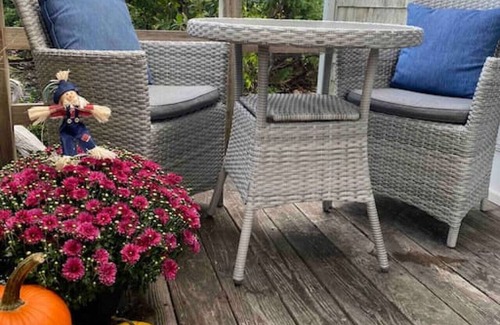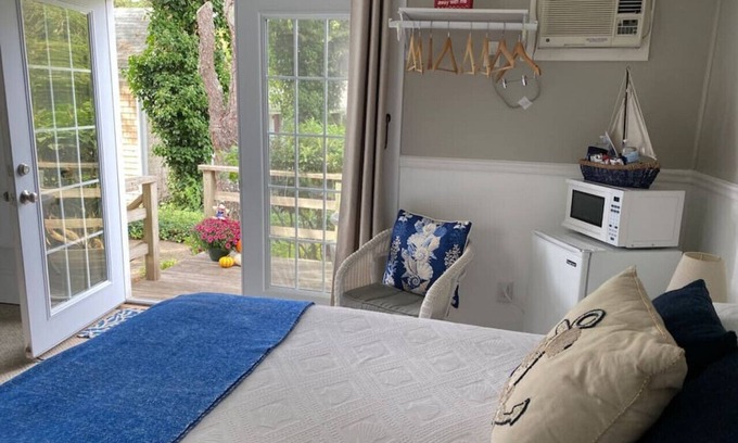Enjoy this classic cape cod oasis directly across the street from Allan Harbor. This space has a private entrance with a table for 2, where you can sit, relax and enjoy the fresh air off the comfort of your room. This space has a king size bed, tv, A.C. unit and heat. Your unit is equipped with a mini fridge, microwave and coffee Keurig machine (with k-cups provided). Lastly, your own private bathroom and shower with towels and linens are provided.