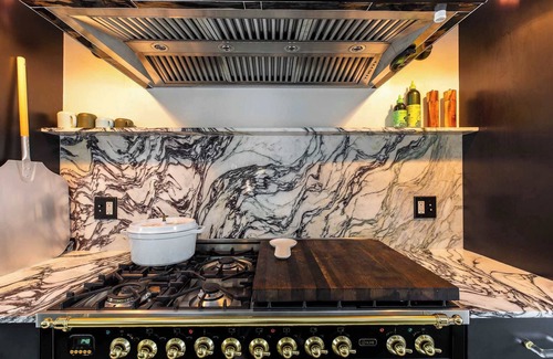 The fully equipped kitchen, located on the main level, showcases sleek black cabinetry with brass hardware complemented by Italian spinning top-shaped pendant lights over the center island. The cooktop is framed by a striking Bianco Ondulare marble backsplash chosen to match the vintage dining table crafted from the same marble. The kitchen also contains a vintage, Danish mid-century secretary desk cabinet, which doubles as a laptop workspace next to a sliding glass door and just off the kitchen is a convenient powder room. The home boasts lots of natural light creating a bright and airy feel.