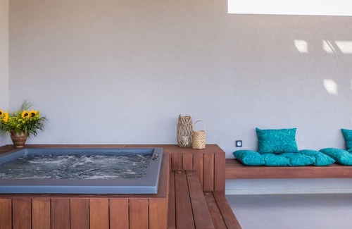 This is a studio of 30 m2 with a king size double bed, shower and a beautiful terrace There is a beautiful terrace with sunbeds and folding dining table and wonderful views to the valley and capital gulf. A private heated jacuzzi is available for two guests.