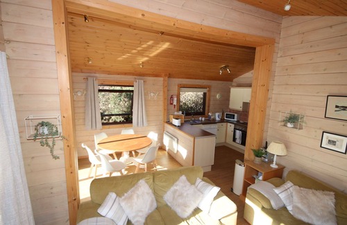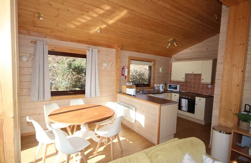 The living area is light and airy with a vaulted ceiling and sliding doors to a decked terrace. There is smart open plan fitted kitchen with hob and oven with extractor hood a fridge/freezer and dishwasher. Should you have a rainy day you can relax in front of the TV on the comfortable squashy sofas and enjoy Sky or a DVD, or have fun playing a board game. The lodge is cosy and warm and perfect for a winter break as well as for summer holidays. Please note there is currently no Wi-fi due to the rural location and limited mobile phone reception.
