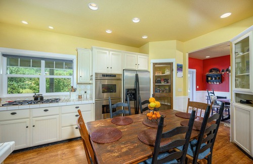 plus the beauty and privacy of two beautiful view acres. The master suite on the main floor has a full attached bathroom, cozy gas fireplace and french doors leading to a private back deck. The deck is the perfect place to sit and enjoy a cup of morning coffee and watch the sunrise over the hills. The kitchen is made for entertaining, open to the living room and extra dining room. Two tables with an ability to sit six at each and everything you need to cook a gourmet meal if you desire to purchase food and eat in, or you can enjoy a dinner prepared for you by the owner who is a private chef and Sommelier, complete with wine pairings for an additional cost. Newberg boasts many wonderful restaurants that specialize in using local fresh ingredients for a true farm-to-table meal.