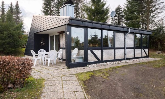 "Haus 11", 4-room bungalow 60 m2. Partly with sloping ceilings, cosy furnishings: living/dining room 30 m2 with satellite TV (flat screen). Exit to the terrace. 1 room 9 m2 with 1 double bed (160 cm, length 190 cm). 2 rooms 6 m2, each room with 2 beds (80 cm, length 190 cm). Kitchenette 5 m2 (4 hot plates, oven, dishwasher, microwave, electric coffee machine). Shower/WC. Electric heating. Terrace 30 m2 partly roofed. Terrace furniture. Facilities: baby cot (extra), logs (extra). Please note: non-smoking house. Maximum 2 pets/ dogs allowed. Smoke alarm, fire extinguisher. The house has a closed fireplace.