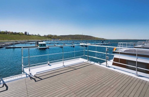 This great houseboat "Family & Friends" offers space for up to 4 people and lots of cozy and maritime flair. Enjoy your vacation with the whole family or spend relaxing days with your friends far away from stress and everyday life. This stationary houseboat is a floating holiday home and has its permanent berth on the Geiseltalsee in the port of Braunsbedra in southern Saxony-Anhalt. Anyone who enjoys being on the water and enjoying the maritime flair in the middle of Germany can go on holiday here. Above all, life on a houseboat means being direct and in tune with nature. When the weather is nice, you can enjoy the sun on the terrace or on the great sun deck. In bad weather, the air-conditioned and very comfortably furnished houseboat with its three interior rooms offers all guests enough space and opportunities to retreat. The glass facades in the living and dining area reinforce the feeling of freedom and closeness to nature and make the houseboat appear bright and friendly - but can be shaded at any time if required. There is a bathroom with a separate toilet. In addition, the heating ensures a cozy atmosphere on board even on cold days. Highlights included: WiFi, all consumption-based energy costs. Activities nearby: The Geiseltalsee is the largest artificial lake in Germany with its 19 km² and is part of the Geiseltaler lake complex. Here you will find endless opportunities to practice water sports. You can do boat tours with various passenger ships, go sailing and diving tours. But there are also a variety of options on land with bike rental for the 25 km long circular route, wine tasting and beaches that invite you to linger. Mobility: Not suitable for people with limited mobility.