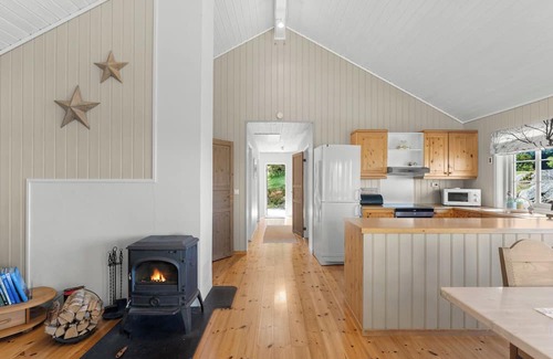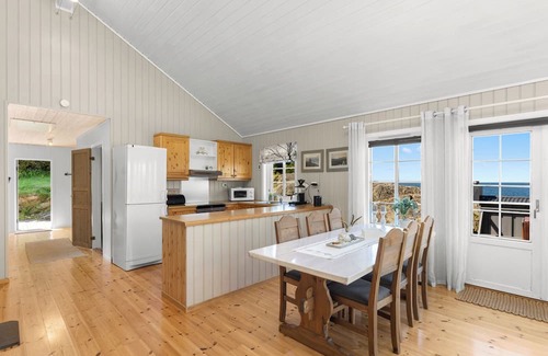 The pretty and well-kept vacation home has all rooms on one floor and contains: Entrance / hallway. Large attic, 3 bedrooms Hems for 2 children from 10 years, toilet room, bathroom with shower cubicle, an open living room with wood stove and heat pump, a well-equipped kitchen with open solution to the living room. The living area has a bright and open space with large windows, some with sea views. Just outside the entrance there is an outdoor storage room.