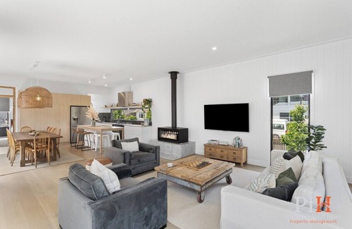 The fully equipped kitchen is a culinary haven, allowing you to whip up delicious meals at your leisure. Bring the family around the substantial dining table for a memorable feast, or enjoy the fun of a board game. Open the wall of bi-fold doors and enjoy a seamless connection to the outdoor deck that adjoins the dining space, perfect for an afternoon drink as you soak up the sun and keep an eye on the chef!