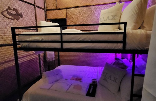 As you enter your own private bungalow through the sliding glass door you will find a cozy bamboo interior. Further adding to the quaint ambiance is our amazing voice controlled color changing light system with custom programs. There is a rack to hang clothes and towels on and we can provide additional space to store luggage if needed.