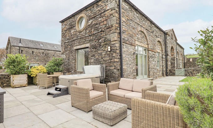 Amenities: Bio-mass central heating with ground floor underfloor heating, radiators on first floor and woodburner. Electric oven and induction hob, microwave, fridge/freezer, washing machine, tumble dryer, dishwasher, 3 x Smart TVs with Freeview, Blue-ray, Bluetooth speaker, WiFi. Fuel, power and starter pack for stove inc. in rent. Bed linen and towels inc. in rent. Travel cot and highchair on request. Off road parking for 2 cars. Private enclosed patio with hot tub, furniture and BBQ and shared use of estates extensive grounds. Sorry, no pets and no smoking. Shop 2 miles. Note: Fishing available on the estate tarn/lake at certain times of the year by prior arrangement with owner. Environmental license required. Note: Due to tarn/lake and hot tub, children must be supervised at all times. Note: WiFi suitable for browsing only. Note: Maximum 4 guests plus 1 infant. Check in and check out days are Fridays and Mondays only.