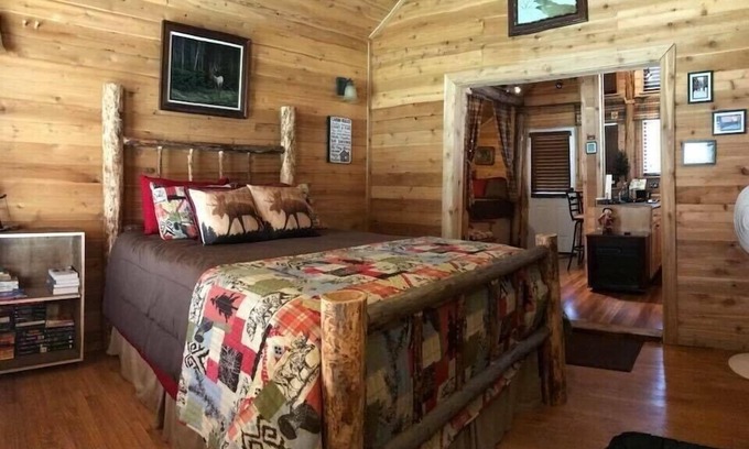 Our vacation rental cabin was renovated in 2016 with beautiful wooden floors throughout the entire cabin and added bathroom and kitchen. The bedroom area features a custom-made queen size log bed made personally by David with logs from our property. We also have a sleep nook that is a huge hit with the kiddos, as well as a futon chair that folds down into a twin size bed. The bathroom has a vanity top, shower, toilet and is fully stocked with towels, hair dryer, soap, and shampoo as well as luxury robes for our guests to use during their stay.