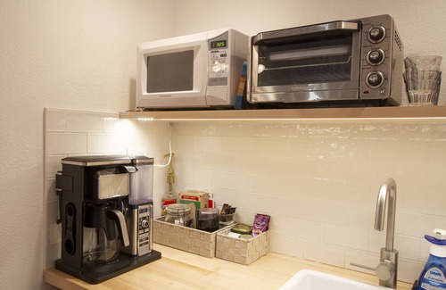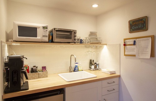 The setting accommodates visitors who want to relax in privacy. The bedroom has a very comfortable (brand new 12/22) Saatva Classic Luxury queen bed, which gets rave reviews, with high thread-count sheets and high-quality towels/washcloths. The living area includes a Scandinavian Design queen sleeper sofa with a very comfortable memory foam mattress. The living area has a workspace with a desk, a USB charging station, and speedy Wifi. Amenities include filtered and sparkling water, local coffee with a Ninja coffee maker/foamer for specialty coffee drinks, a coffee press (for those who like it simple), and a variety of teas and an electric tea kettle. The cottage is perfectly suited for simple food prep as it is equipped with a sink, utensils, dishes, bowls, microwave, toaster oven, and under-counter refrigerator. An induction stovetop is available on request. The use of outdoor bbq is also available on request.