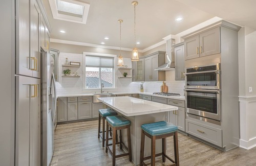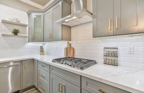 Kitchen and Dining: The immaculate fully-equipped kitchen featuring stainless steel appliances, solid countertops and a welcoming island with seating will have you feeling right at home upon your arrival. After you get settled in, take a stroll through this very walk-able vibrant neighborhood and check out the sights. Grab a bite to eat just downstairs or at one of many nearby eateries. When you want to stay in, you'll have everything you need in your chef's dream kitchen in order to create meals at home. The glass dining table and upholstered chairs seats six and the chairs can easily be brought over near the sofa when everyone wants to gather to watch a movie or chat.