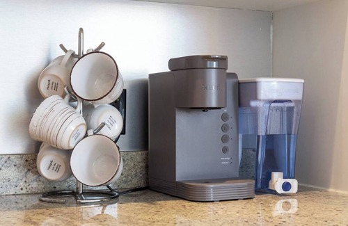 The kitchen has a dining table with seating for four, as well as all the essentials; (coffee, pots, pans, oil, salt/pepper). The kitchen and dining space flow nicely into the living area. This open floor plan makes it easy to cook, eat, relax, entertain and feel connected to the people you're traveling with.