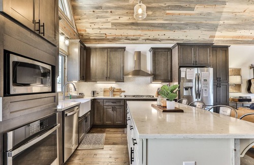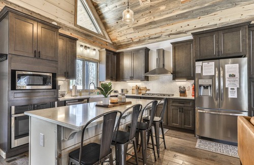 Inside, you will be thrilled to find beautiful and comfortable furnishings, as you would expect in a luxury mountain home. The main floor has an open floor plan, perfect for entertaining. The fully equipped kitchen provides everything needed to create some tasty meals and it has an island that seats four. The living room has a gas fireplace and is a favorite spot to enjoy conversation with family/friends.