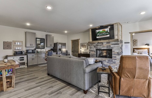 The downstairs Terrace Level provides a great place for those seeking privacy from the rest of the group. Complete with living area and gas fireplace, game area with and a mini kitchen with refrigerator, microwave, toaster oven and coffee pot, you may never want to leave! You will also find a dining table with chairs for 4 on this level. There is a king bedroom as well as a full bath with walk in shower. You can access the terrace deck on this level where the brand new hot tub sits, just waiting to soak your cares away.