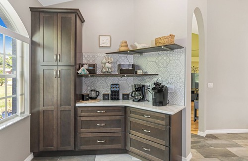 Our kitchen is fully equipped and we provide all of the essentials you’ll need for you stay. Our coffee area includes a Keurig coffee pot, standard coffee pot and tea kettle. We include starter coffee pods, coffee, tea and sweeteners. We also provide basic start up supplies such as dish soap, dishwasher soap, trash bags, paper towels and more. Our refrigerator includes filtered water and ice.